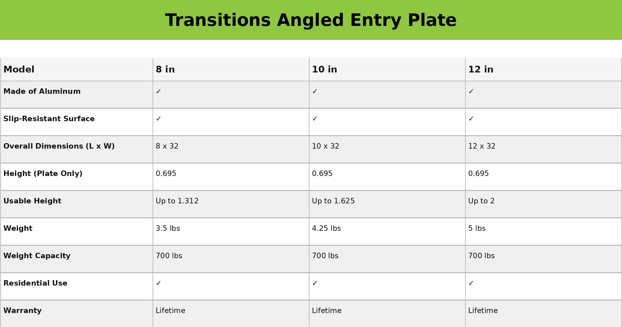 The TRANSITIONS® Angled Entry Plate is a portable stand-alone threshold plate with a slip-resistant applied surface for superior traction. This single-piece, formed aluminum plate helps to eliminate trip hazards and accommodates most mobility devices. The Angled Entry Plate is available in 8″, 10″, and 12″ lengths.