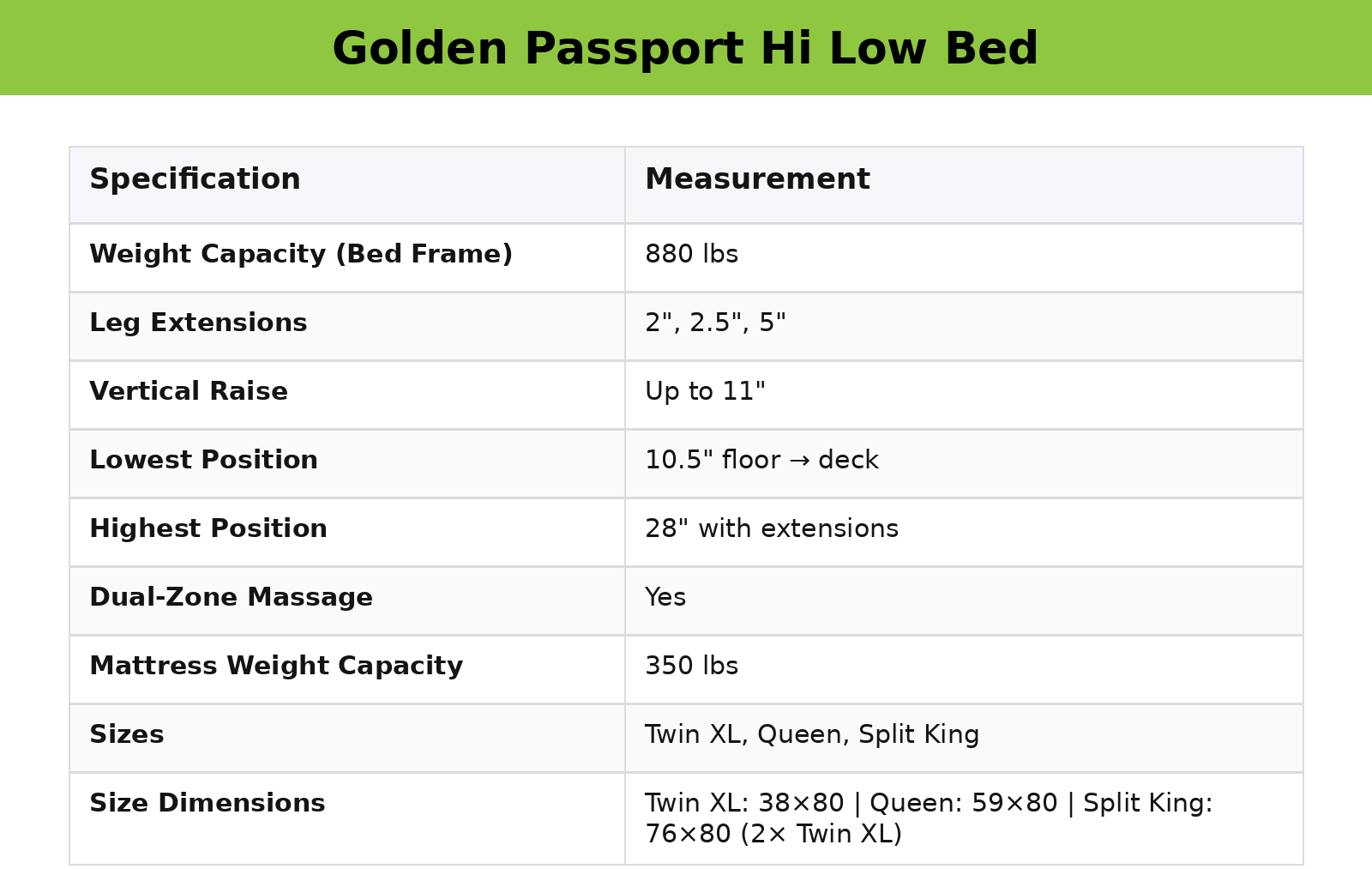 The Golden Passport offers many unique and luxurious properties, and is available in Twin XL, Queen, and Split King ( Dual Twin XL) & one standard foam mattress. The Golden Passport will provide users with peace of mind knowing they can pursue their own independence.