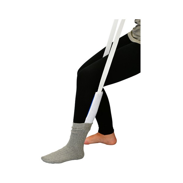 GET YOUR SOCKS ON WITH EASE & COMFORT with the sock aid that is designed to assist getting your socks or hosiery on. The soft terry cloth outside prevents slipping, while the nylon inner lining reduces friction and gentle on your skin. NO BENDING OR STRAINING necessary with the 27” straps with easy-to-grip looped handles. Now, you can pull your socks up with ease. FLEXIBLE DESIGN makes it easy to insert your socks or stockings. See the image for the quick and easy instructions. TAKE WITH YOU AND USE ANYWHERE. Easy to carry in a purse or bag and take with you anywhere. DIMENSIONS: 2.25”H x 6”W x 12.75”W