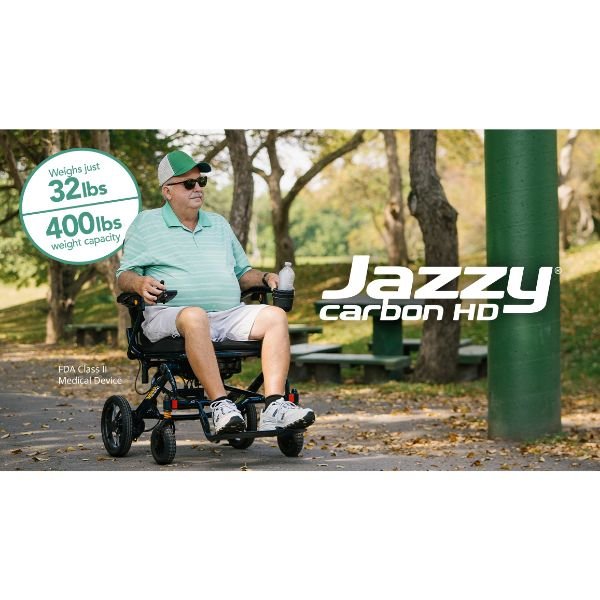 The wait is over for a truly travel‑friendly, heavy‑duty power wheelchair. The Jazzy® Carbon HD combines portability with strength, featuring a durable carbon fiber frame, an impressive 400 lb. weight capacity, and a lightweight design that weighs just 32.2 lbs. without the battery. Built for life on the go, it delivers greater freedom and independence wherever your travels take you.